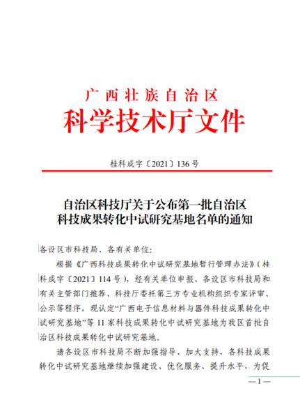据了解,广西壮族自治区科技成果转化中试基地建设,是破解自治区中小企业的中试验证难题,加快推进科技成果在区内转化和产业化应用的重要举措。此次全区共有11个中试基地获批。
