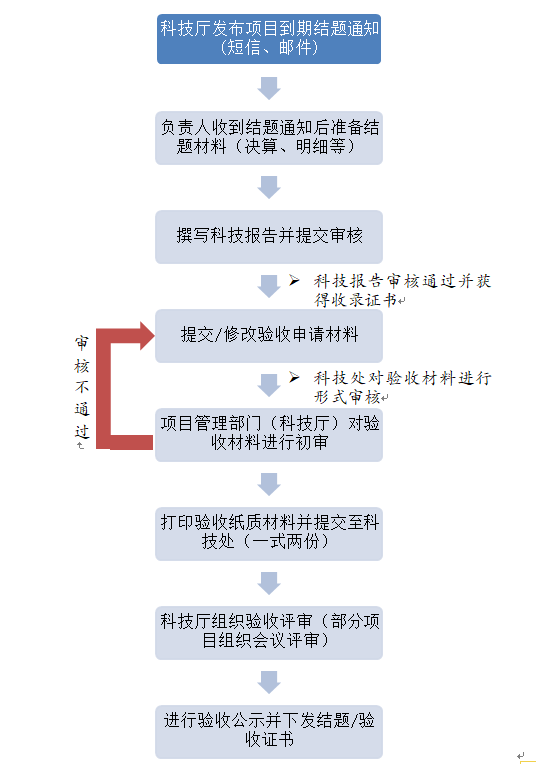 (一)请相关负责人在项目到期前申请结题,要求务必在项目到期后1个月内完成科技报告填报以及验收申请提交工作,科技处会及时审核科技报告及验收材料并报送至科技厅。